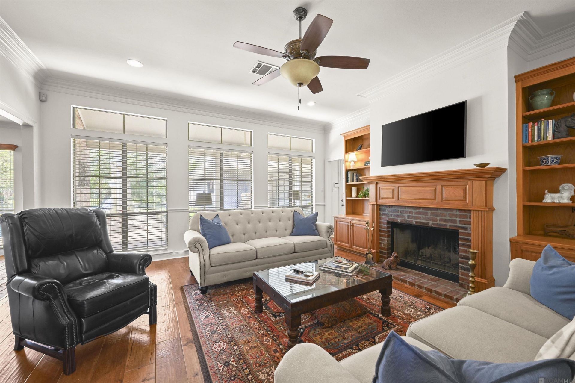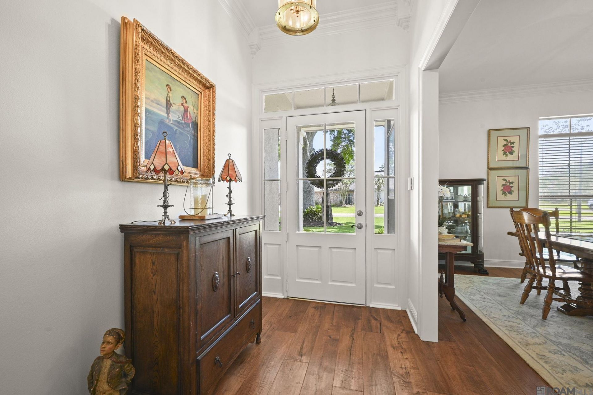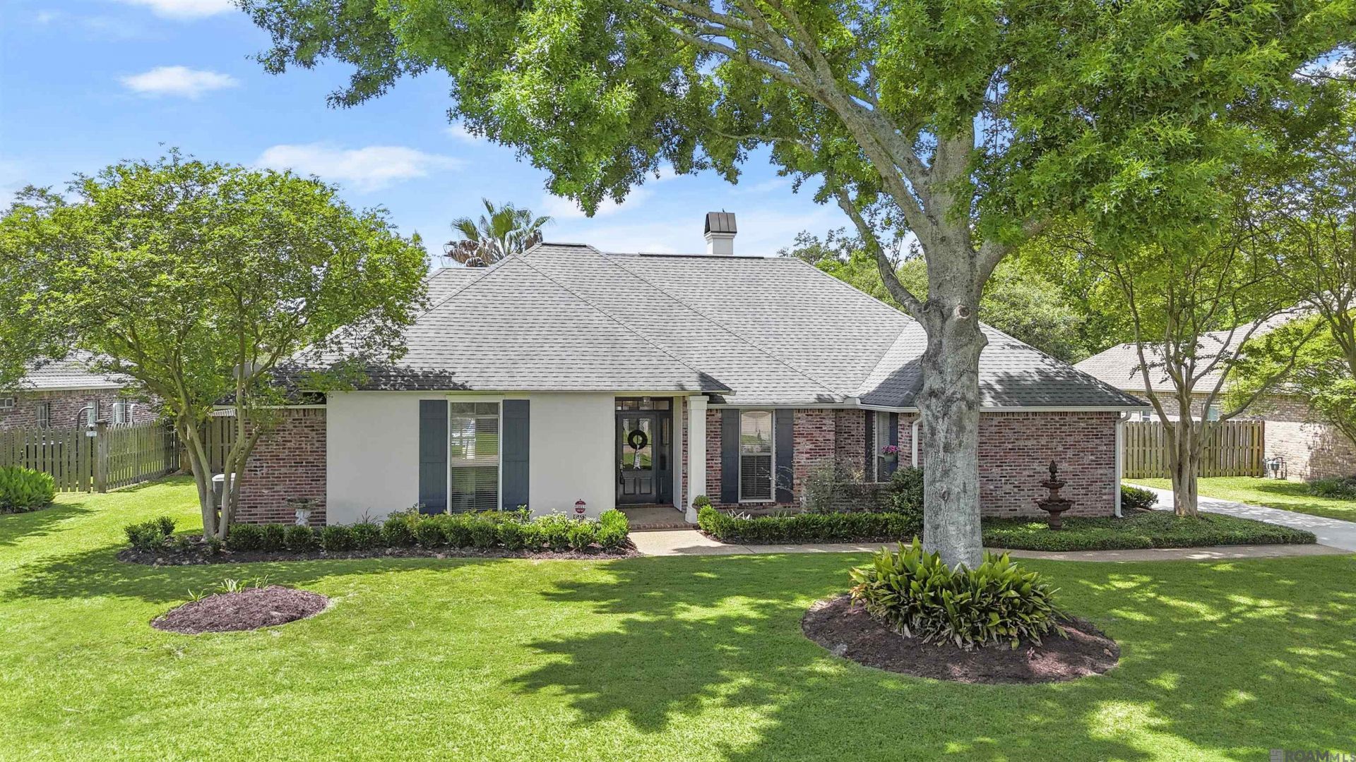 Welcome to this beautifully maintained 4-bedroom home in the prestigious Seven Oaks subdivision in Prairieville, perfectly situated on the lake. This exceptional property features a desirable triple-split floor plan, beautiful wood flooring, custom built-ins, triple crown molding, a cozy fireplace, and a wall of windows that fills the home with abundant natural light. The spacious kitchen is designed for both everyday living and entertaining, offering custom cypress cabinetry, a beamed ceiling, custom tile backsplash, double wall ovens, granite countertops, and a large island with a gas cooktop. Just off the kitchen, the generous breakfast area overlooks the outdoor swimming pool, creating the perfect setting for casual dining. A formal dining room provides additional space for hosting friends and family. The private master suite features a tray ceiling and a luxurious en-suite bath with double vanities, a large soaking tub, and a custom-tile shower. Step outside to your own private oasis featuring a covered patio, a charming arbor, a wrought iron gateway, and a beautiful saltwater swimming pool surrounded by palm trees, manicured landscaping, and serene views of the lake. This stunning lakefront home offers the perfect blend of comfort, elegance, and outdoor living. (Pool liner, salt generator and pump replaced 2 years ago).