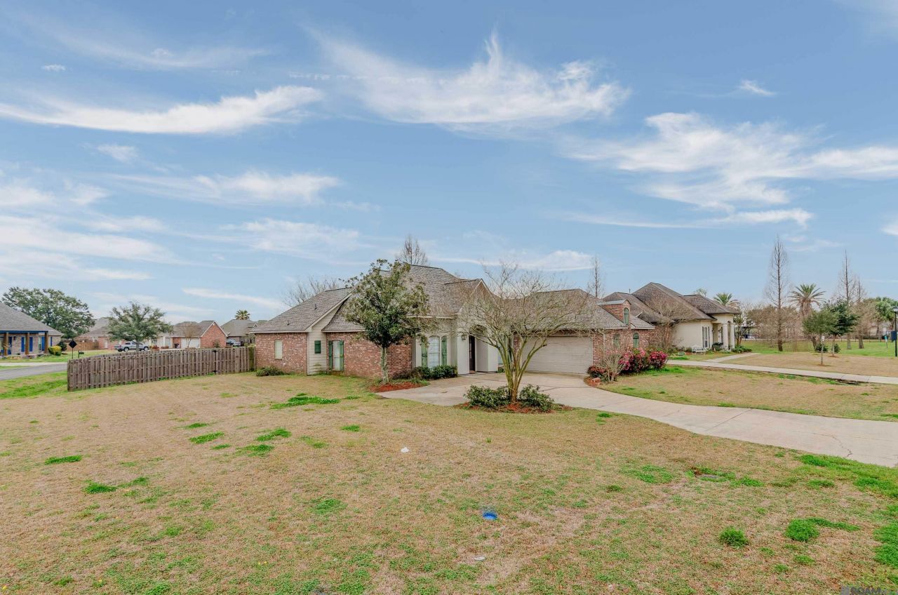 Priced to sell! Great opportunity to own this 3-bedroom, 2.5-bath home on a large corner lot just off I-10, across from Pelican Point in Gonzales. A welcoming foyer opens to a formal dining area and spacious den featuring wood flooring, a fireplace, and built-in cabinetry. The kitchen offers ample cabinet space and flows into the breakfast area, with a large utility room conveniently located nearby. This split floor plan provides privacy, with the primary suite located at the rear of the home. The primary bath includes generous vanity space, a jetted tub, separate shower, and an additional sink area in the water closet. Two secondary bedrooms are situated at the front of the home, one boasting 12' ceilings, while the remainder of the home features 9' ceilings throughout. The standout feature is the outdoor living space. The cabana/gazebo includes cypress beams, a full brick fireplace, sink, two-burner cooktop, natural gas built-in grill, and a large concrete bar area perfect for entertaining. The backyard offers multiple fenced sections, including a garden area, flagstone pathways, and a fountain that will remain. Additional features include pre-wiring for security, some gutters, a double garage with a half bath, and approximately 300 feet of culverted frontage and side yard. A solid home with fantastic outdoor amenities at a great price!