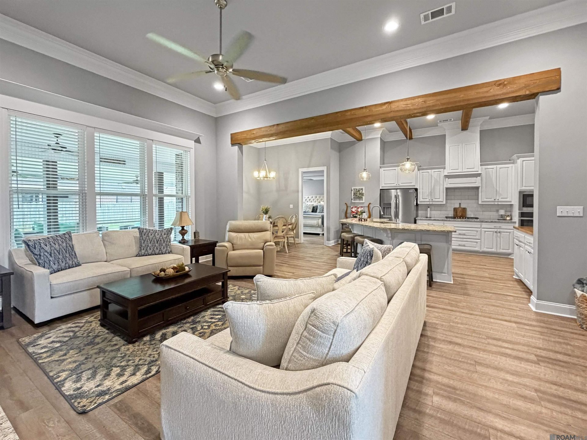Built in 2022, this stunning 4-bedroom, 3-bath home offers the perfect blend of modern design and everyday comfort, all with the feel of new construction. From the moment you step inside, you're welcomed by soaring 12-foot ceilings, an abundance of natural light, and beautiful wood beam accents that seamlessly connect the kitchen, living, and dining spaces creating a warm yet elevated atmosphere ideal for both relaxing and entertaining. The kitchen is both stylish and functional, featuring stainless steel appliances, granite countertops carried throughout the home, and a beautiful butcher block accent that adds warmth and character to the space. The thoughtfully designed split floor plan provides privacy and functionality, while the spacious primary suite features a convenient flow from the bedroom to the closet and directly into the laundry room making daily living effortless. Each additional bedroom is generously sized, offering flexibility for guests, a home office, or growing needs. Step outside to an extended covered patio, perfect for unwinding in the evenings, hosting gatherings, or enjoying your morning coffee in a peaceful setting. Nestled on a quiet street in Plainview Ridge, this home offers a sense of serenity while still being just minutes from local shopping, dining, and everyday conveniences. Located in the highly sought after Live Oak school district and situated in Flood Zone X, this property truly checks all the boxes.