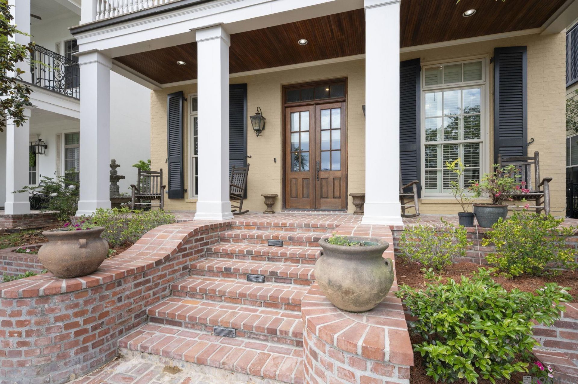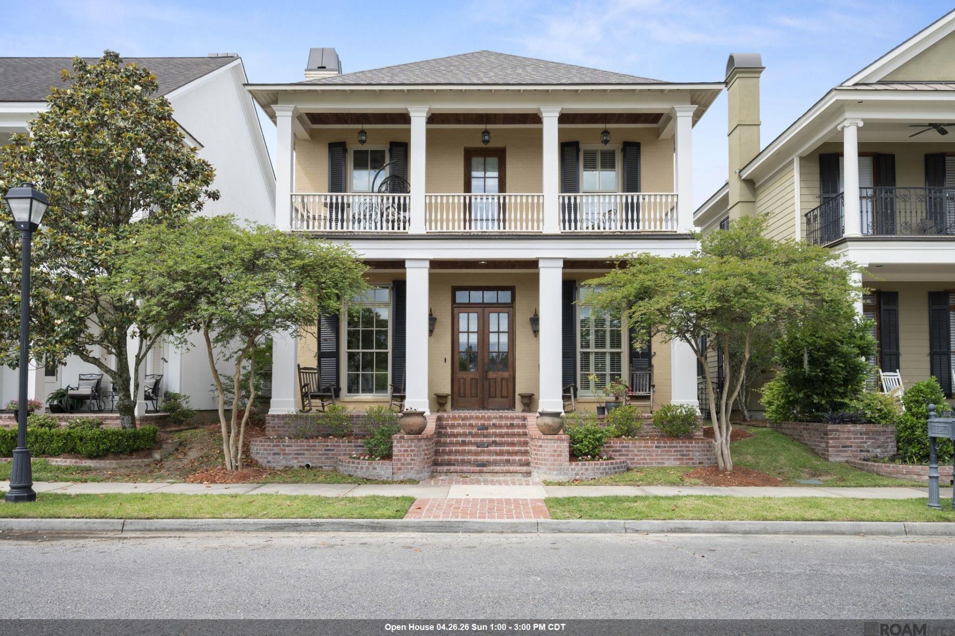Indulge in refined Southern elegance in this exquisite New Orleans-style residence, ideally situated in the coveted Village at Magnolia Square. Thoughtfully designed with timeless architectural detail, this home showcases soaring ceilings, intricate custom molding, reclaimed old pine beams, and a stunning brick fireplace that anchors the sophisticated living space. The gourmet kitchen is a true centerpiece, featuring custom cypress cabinetry, granite countertops, an oversized island, designer hood vent, gas range, and premium stainless-steel appliances, perfectly blending style and function for both everyday living and entertaining. Step outside to your private brick-enclosed courtyard and curated outdoor living area, complete with a cozy fireplace and built-in gas grill, an inviting extension of the home designed for effortless gatherings. The well-appointed split floor plan offers a luxurious primary suite and guest accommodations on the main level, while the second-floor features two additional bedrooms, a full bath, and an expansive bonus living area or game room. Enjoy tranquil lake views from the charming Southern-style balcony. The primary en-suite is a serene retreat, boasting a spa-inspired bath with a soaking tub, custom tiled walk-in shower, dual vanities, and an extraordinary boutique-style closet with built-ins, all accented by elegant chandelier lighting. This meticulously maintained home also features energy-efficient foam insulation, a new roof, and tankless water heaters for modern comfort and peace of mind. Residents of Magnolia Square enjoy exclusive access to a community pool and playground, all just moments from premier shopping and dining.